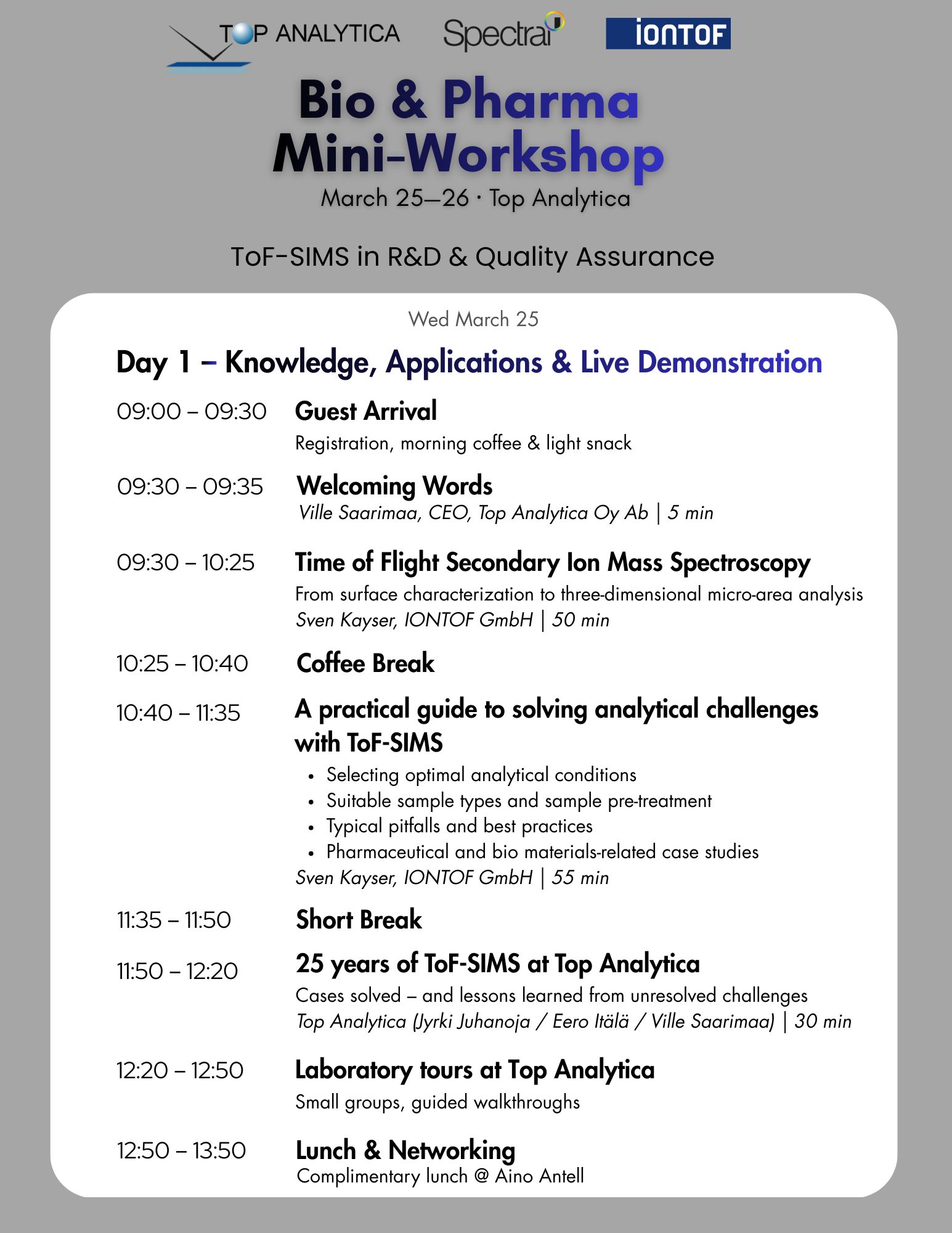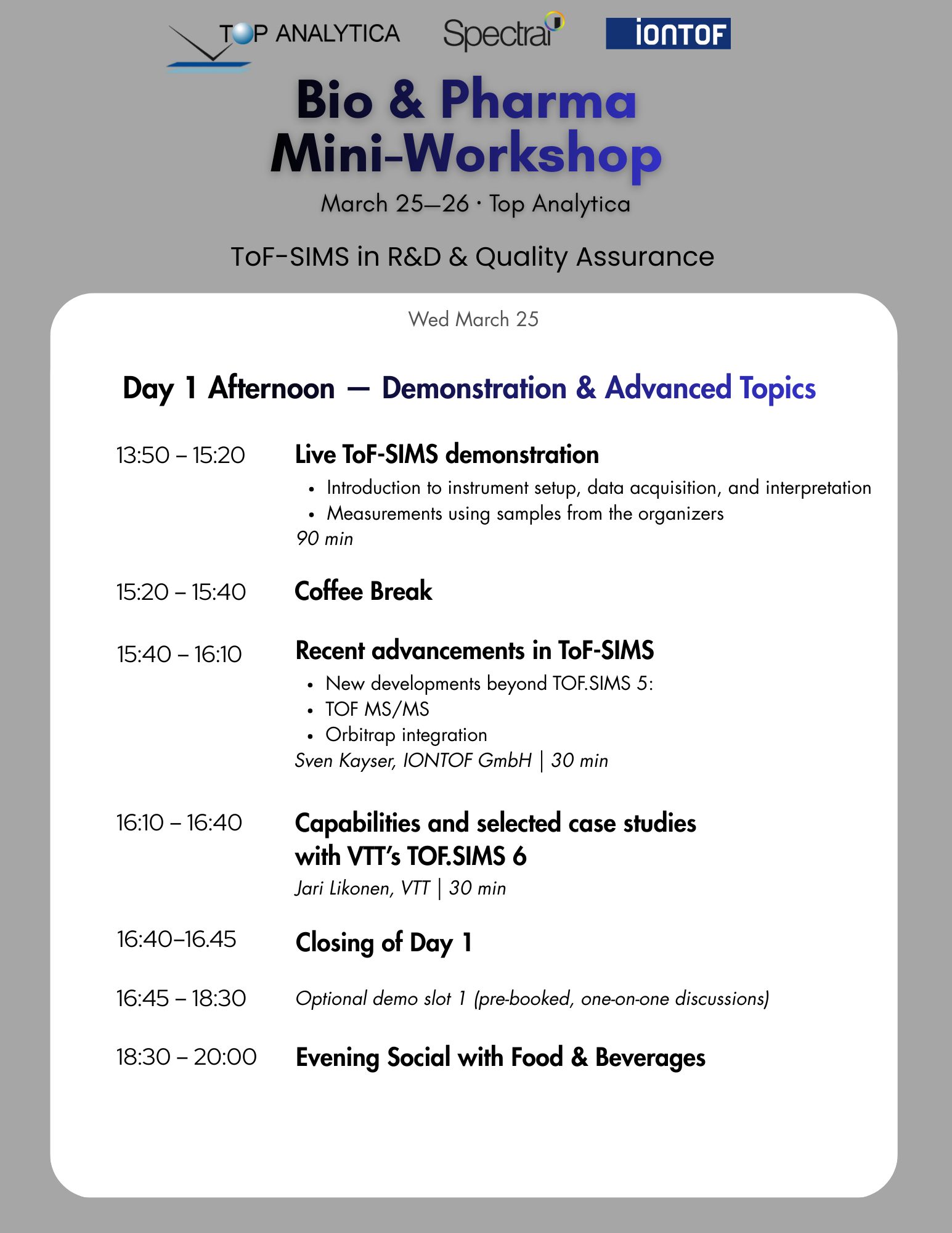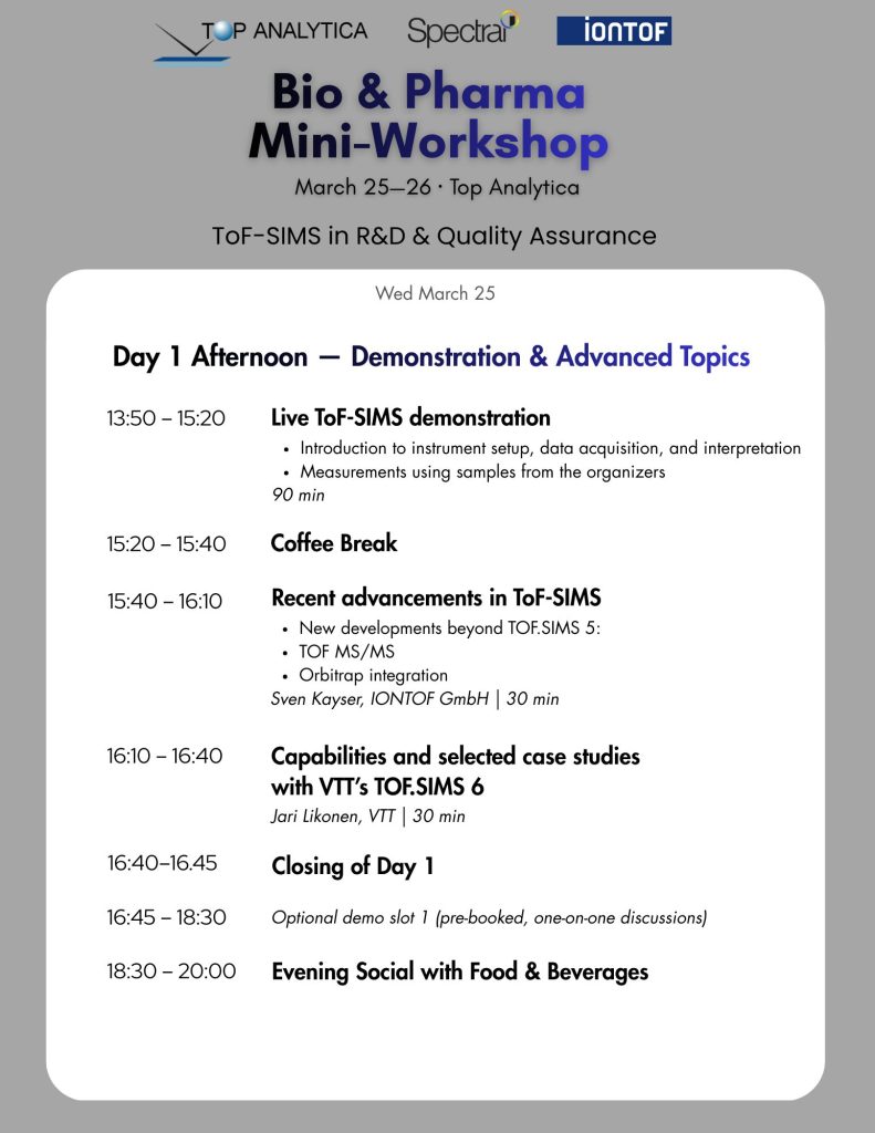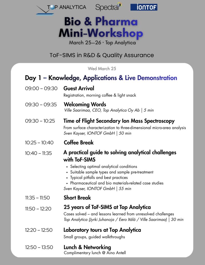 Join us for the Bio & Pharma Mini-Workshop 25.—26.3.2026 for ToF-SIMS in R&D & Quality Assurance in Turku, Finland, hosted by Top Analytica! This focused two-day event brings together professionals from pharmaceutical R&D, quality assurance, and biomaterials research to explore surface chemistry, molecular analysis, and ToF-SIMS applications.